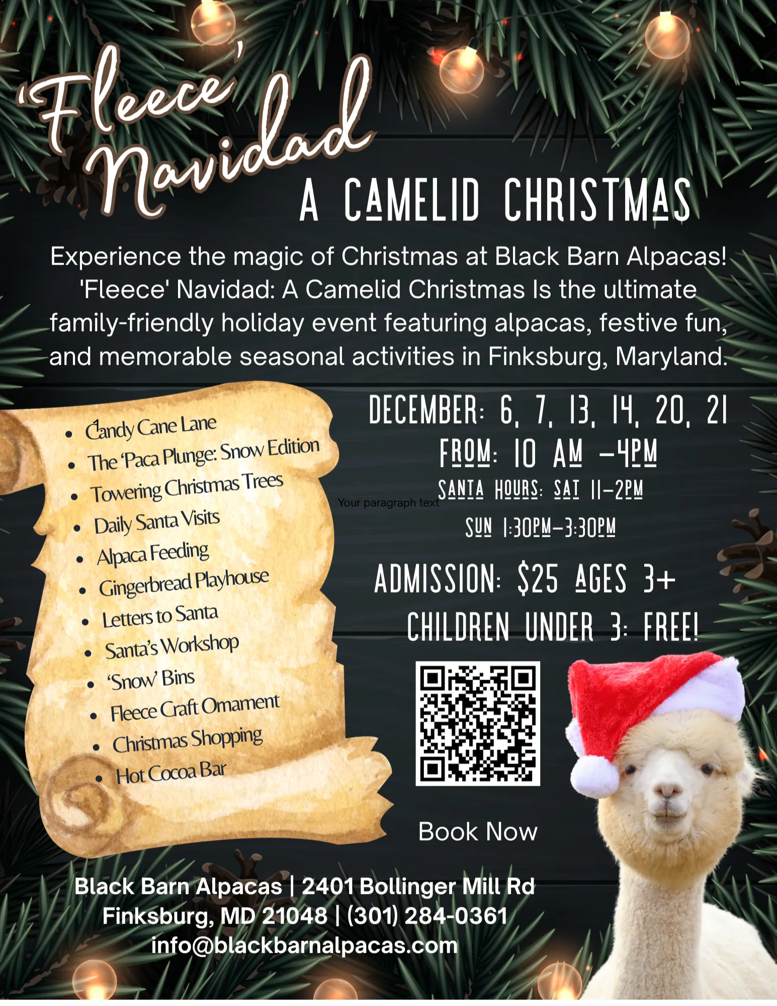 We’re so excited to announce the return of our 2nd annual Fleece Navidad: A Camelid Christmas at Black Barn Alpacas! 🦙🎅